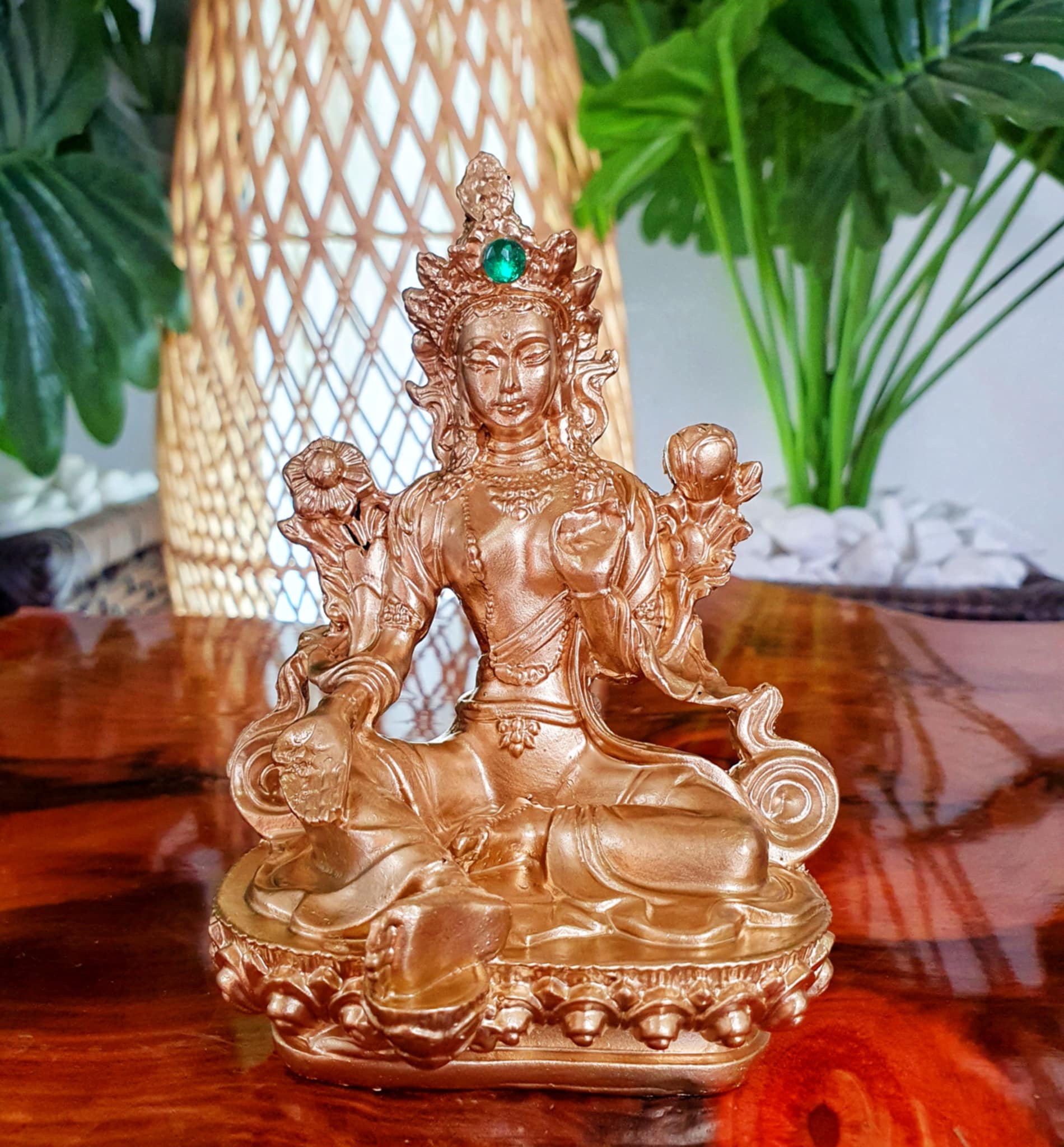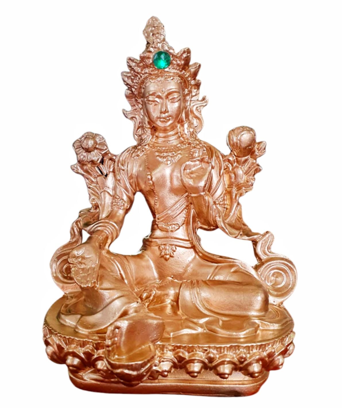 A Deusa Tara Dourada, também conhecida como Vasudhara, é a deusa budista da riqueza, prosperidade e abundância. A cor dourada com Cristal Verde, está associada a metais preciosos e simboliza opulência, fertilidade, saúde e generosidade na iconografia budista. Ela é vista como a deusa que guia os seguidores no caminho espiritual, sendo a encarnação da sabedoria aperfeiçoada e a mãe de todos os Budas.