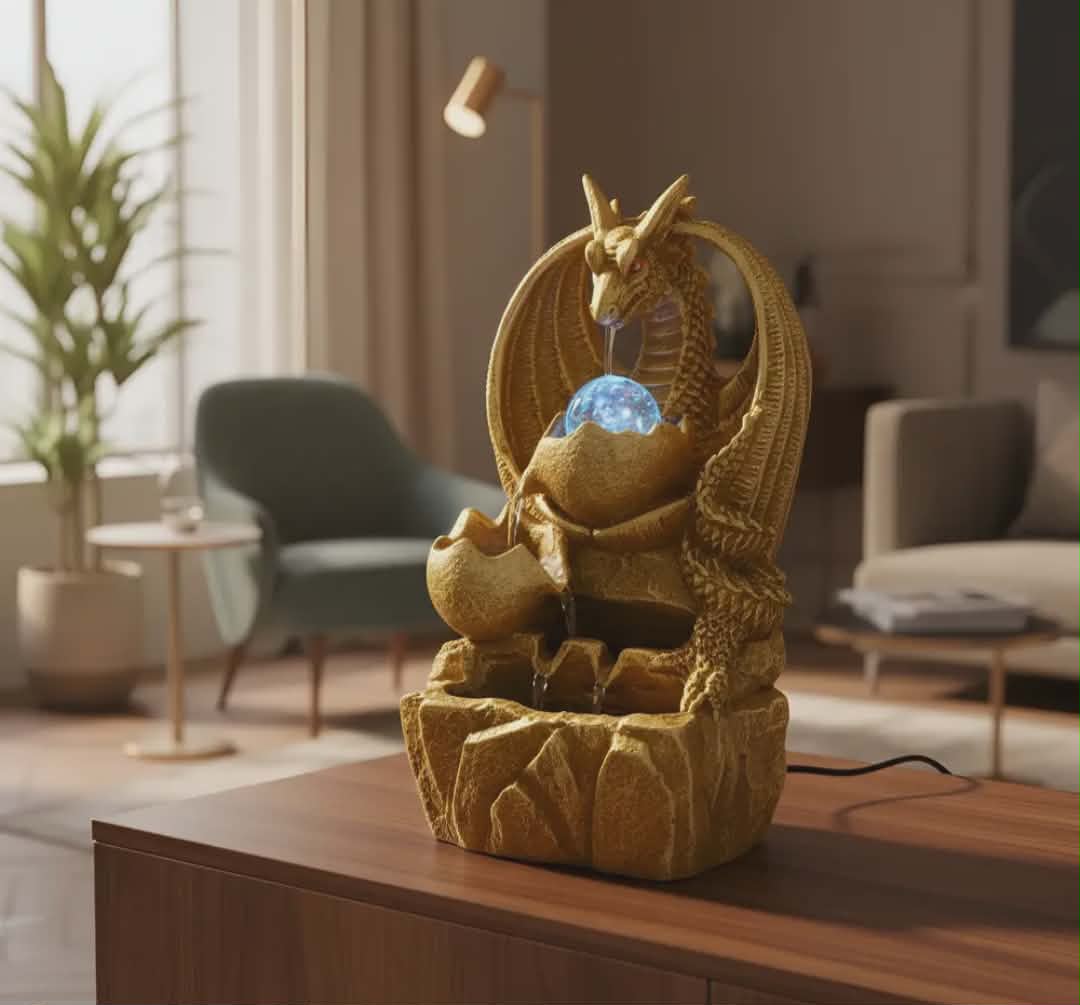 Com um design encantador de dragão medieval, esta fonte de 30 cm de altura e 15 cm de diâmetro é perfeita para adicionar um toque de elegância e tranquilidade ao seu ambiente. Feita de resina, ela combina beleza e resistência, tornando-se um elemento decorativo que se destaca em qualquer lugar. A fonte inclui uma bomba de água, garantindo um fluxo contínuo e suave, enquanto a iluminação integrada cria um efeito visual deslumbrante, especialmente à noite. Com dimensões de 20 cm de comprimento e largura, é ideal para varandas, jardins ou interiores, proporcionando um ambiente relaxante e harmonioso. Alimentada por corrente elétrica, a Fonte Dragão Oriental é prática e fácil de usar, permitindo que você desfrute de seu som relaxante de água sem complicações. Adicione um toque de serenidade e estilo ao seu lar com esta peça única que certamente encantará a todos. *Produto Artesanal podem ocorrer variação na tonalidade, cor , tamanho.