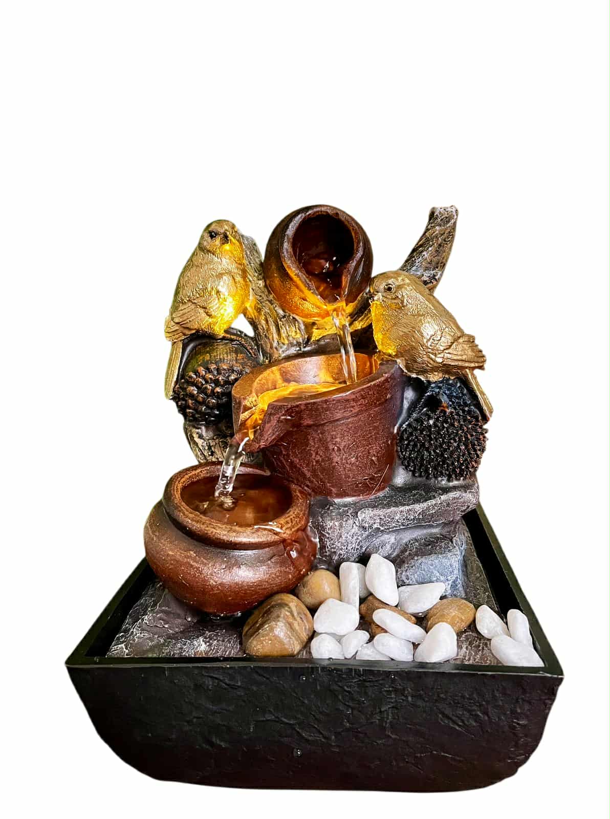 A água que flui a partir dos jarros simboliza prosperidade e serenidade, tornando-a uma adição única para qualquer espaço. Seja para meditação, relaxamento ou simplesmente para embelezar o ambiente, a Fonte de Água Jarros Casal de Passarinhos é uma escolha perfeita. Eleve a sua decoração com este encanto aquático e desfrute dos benefícios de um ambiente mais harmonioso e inspirador.