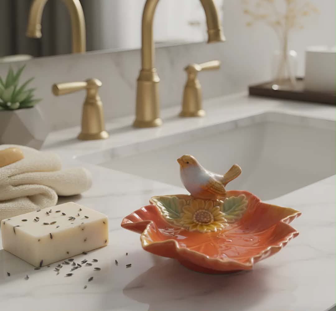 Saboneteira Com Passarinhos Girassol Flor Feito De Porcelana Colorida